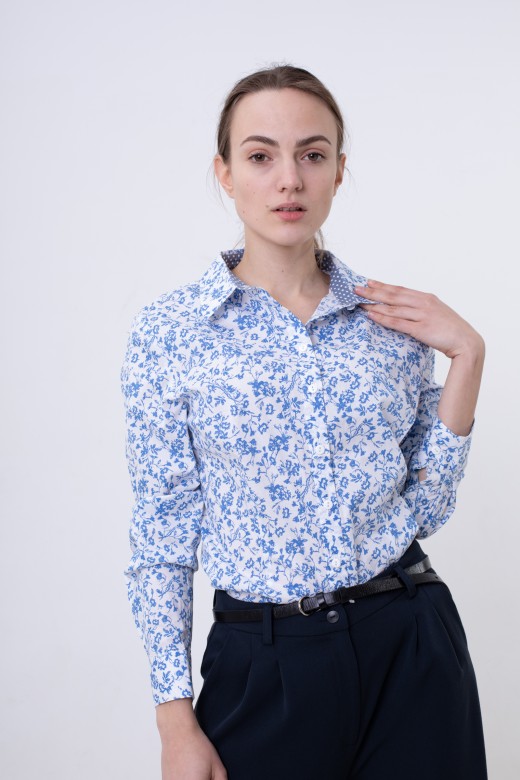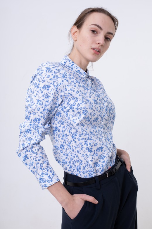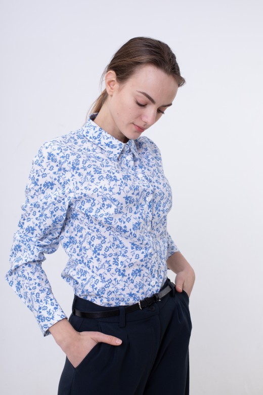 Блузка женская полуприлегающего силуэта, с центральной застежкой на пуговицы. Перед с нагрудными и таллиевыми вытачками. Спинка с таллиевыми вытачками. Воротник стояче-отложной с отрезной стойкой. Рукава втачные, одношовные, с двумя складками и разрезами по низу. Низ обработан притачной манжеткой застегивающейся на 2 пуговицы. Длина изделия 63 см. Длина рукава 62 см. Стирка при t 30 °C.