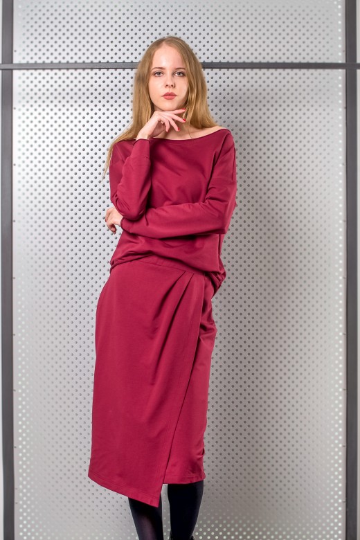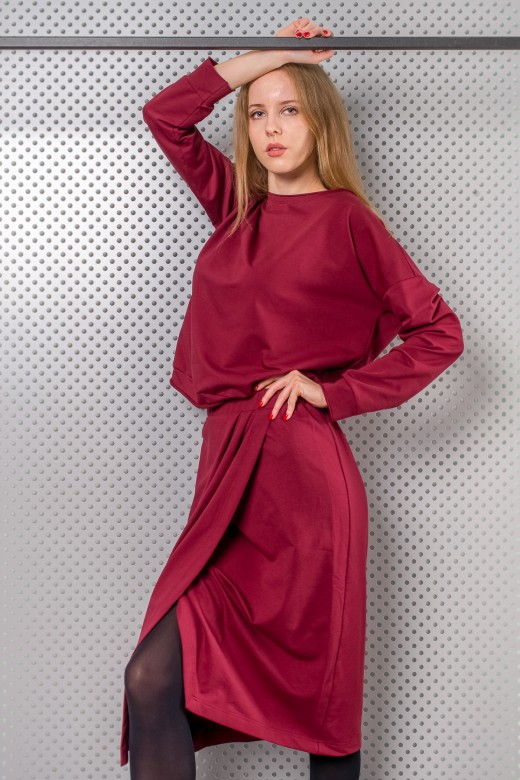 Костюм состоит из джемпера и юбки. Джемпер объёмной формы со спущенной линией плеча и рукавом рубашечного покроя. Длина изделия по спинке 60 см. Длина рукава с плечевым швом 72 см. Юбка прямого силуэта с имитацией запаха. Пояс отрезной на резинке. По переду две декоративные складки. Длина по боковому шву 75 см. Стирка при t 30 °C.